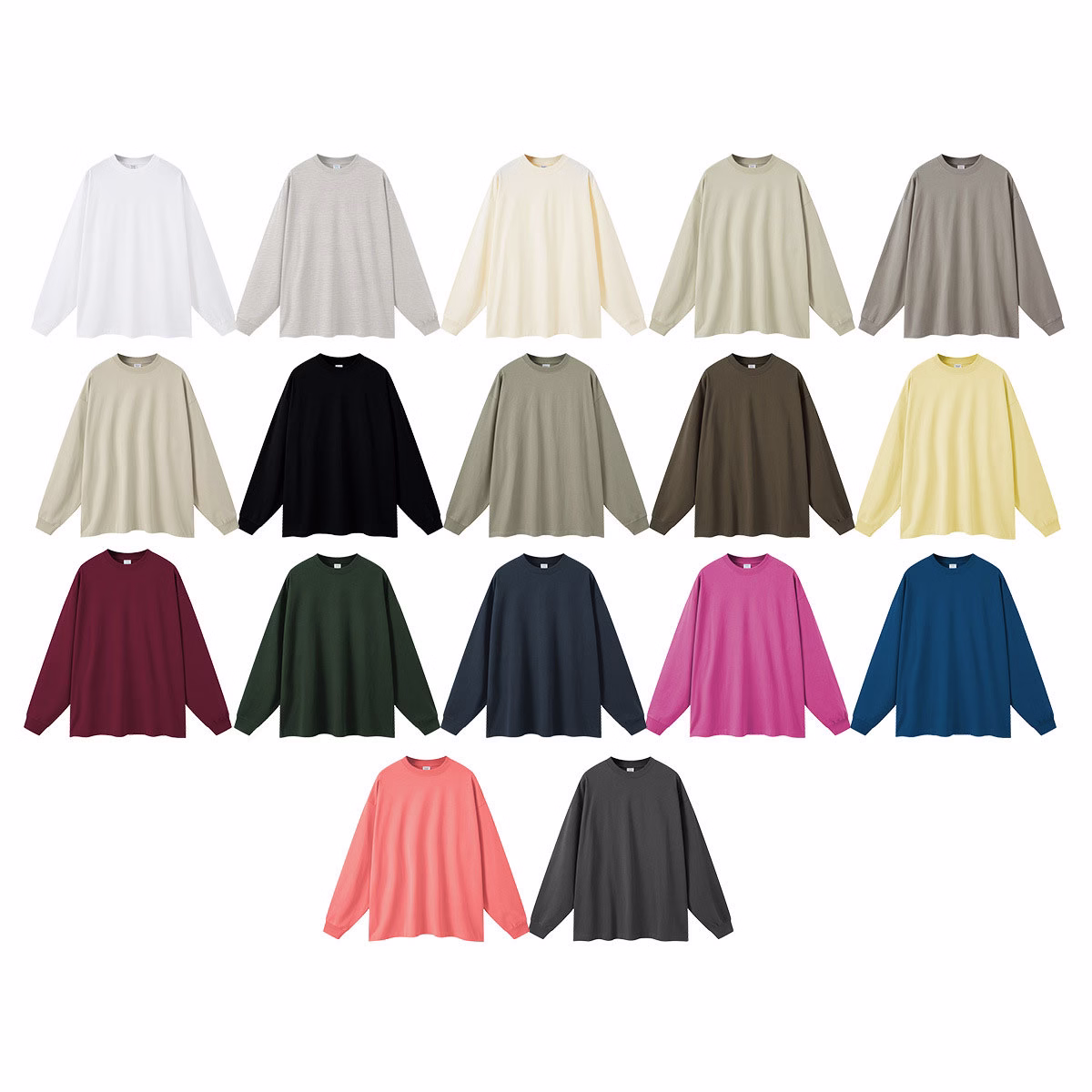 Yali Clothing supplier 305gsm long-sleeved T-shirt made from 100% cotton or an 80% cotton/20% polyester blend. It’s thick and soft, with an oversized fit and an O-neck collar, perfect for both men and women. The flat-dyed knit is durable and available in colors like white, blue, gray, and black, or custom colors. Available in sizes M-3XL. Digital printing and embroidered logos are also available.
