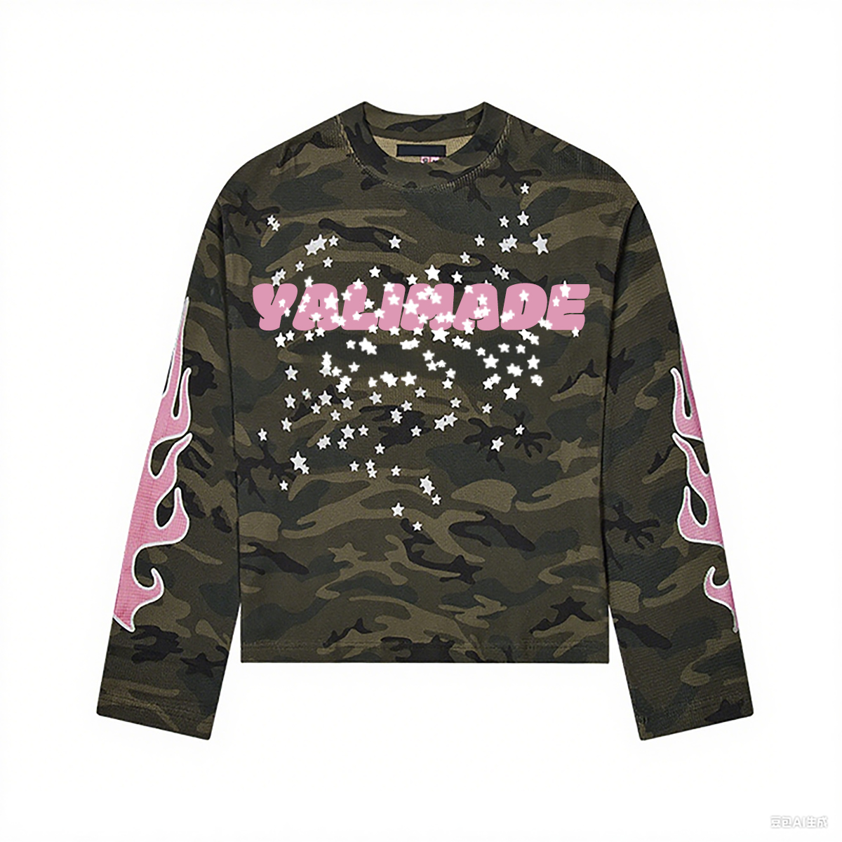 La T-shirt a maniche lunghe di Yali Clothing si ispira alle vibrazioni dello streetwear, grazie al puro cotone 100% e a una tintura unica che crea un audace sfondo mimetico. Tocchi di stelle e un logo in evidenza conferiscono un tocco personale, mentre il trasferimento termico mantiene la stampa resistente e a prova di sbiadimento. Il girocollo è elegante, mentre i polsini a fantasia conferiscono un tocco di stile in più. Con un peso di 160-180 grammi, il tessuto è solido e arioso, in grado di evitare le grinze e il restringimento. Le taglie vanno dalla XS alla 5XL, con la possibilità di applicare loghi o confezioni personalizzate per chi desidera un look unico a marchio privato.