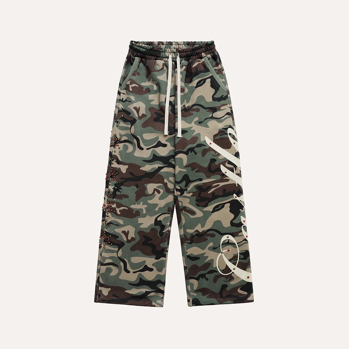 Yali-Clothing Op maat gemaakte joggingbroek met studs, strass-steentjes en camouflageprint, oversized baggy fit