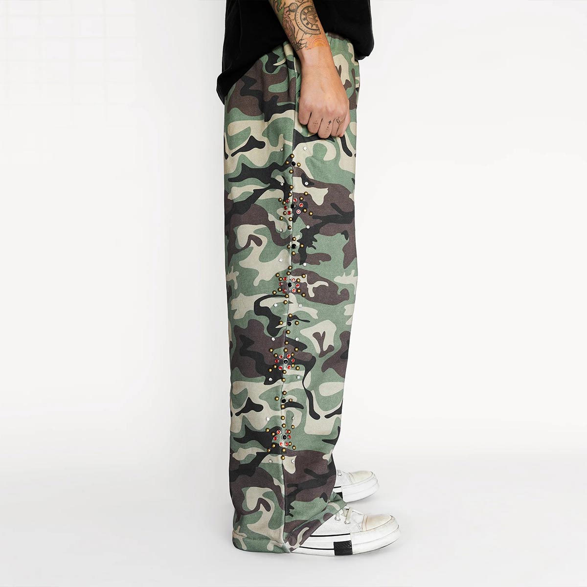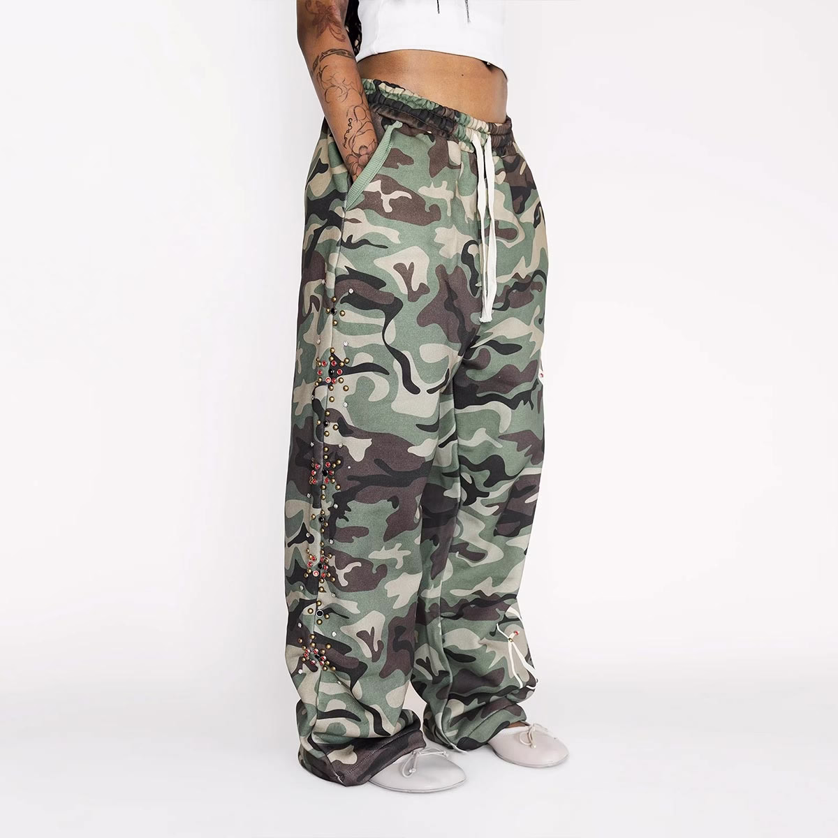 YALI Kleding Op maat gemaakte joggingbroek met studs, strass-steentjes en camouflageprint, oversized baggy fit