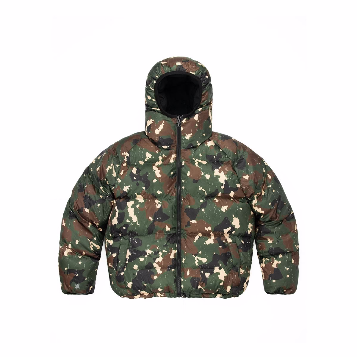 Yali-Clothing OEM пользовательский двусторонний пуховик. Внешний слой изготовлен из полиэфирного волокна 100% с водонепроницаемым покрытием, которое легко противостоит дождю и снегу. Внутренний слой также изготовлен из полиэфирного материала, что обеспечивает мягкость и комфорт при прикосновении к коже. Наполненный белым утиным пухом 90%, он пушистый, но не громоздкий. Черная сторона простая и элегантная, с двумя нагрудными карманами на пуговицах и боковыми карманами на молнии с флисовой подкладкой для практичности и защиты от ветра. Переход на камуфляжную сторону, где камуфляжный рисунок в виде брызг чернил напоминает художественное граффити. Основной тон - зеленый, испещренный коричневыми, черными и белыми пятнами, а камуфляжный рисунок продолжается на капюшоне. Капюшон имеет эластичные манжеты и высокий воротник, а рукава реглан обеспечивают большую свободу движений.