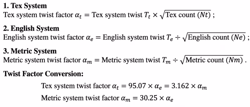 Twist per unit length alone cannot compare the twist level of yarns with different thicknesses, because for the same twist, a thicker yarn has fibers with a greater inclination angle than a finer yarn. In practical production, twist coefficient is commonly used to indicate the yarn’s twist degree.